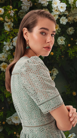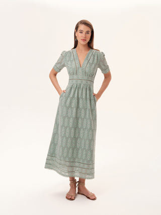 The Lisbon V-Neck Short Sleeve Dress in Sage Green Cotton Eyelet: Artisanal Sage Green Midi Dress for Women