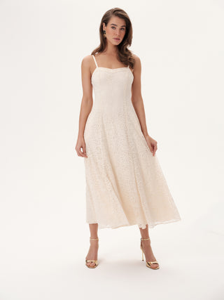 The Paris Romantic Midi Strap Dress in Champagne Cream Lace: Artisanal Champagne Midi Dress for Women