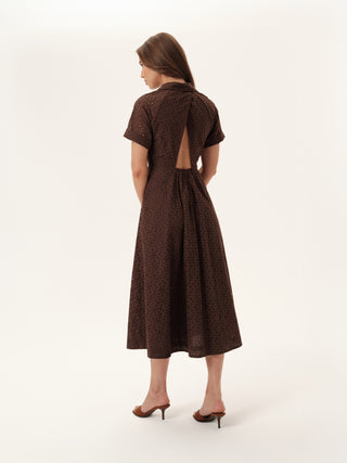 The Sydney Shirt Dress in Chocolate Brown Eyelet: Artisanal Chocolate Brown Midi Dress for Women