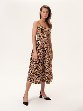 The Madrid Corset Midi Strap Dress in Leopard Print Cotton: Artisanal Leopard Midi Dress for Women