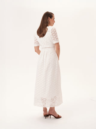 The Lisbon V-Neck Short Sleeve Dress in White Circles Lace: Artisanal White Midi Dress for Women