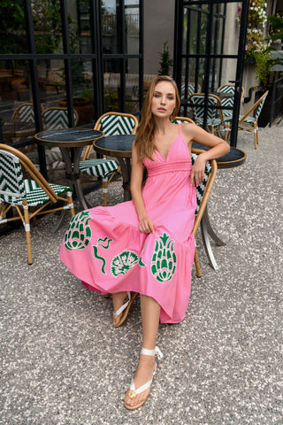 The Meraki Summer Dress in Pink Lemonade Ottoman Tulips: Artisanal Pink Maxi Dress for Women
