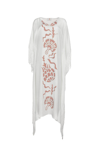 The Virginia Kaftan, in Flamenco & Ottoman. White & Pink Embroidered Silk-Linen