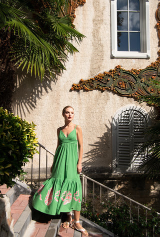 The Meraki Summer Dress in Green Apple Ottoman Tulips: Artisanal Green Maxi Dress for Women