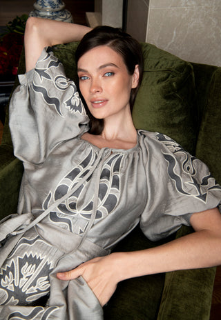 The Meraki Signature Dress in Silver Grey and Charcoal Ottoman Tulips: Artisanal Silver Midi Dress for Women