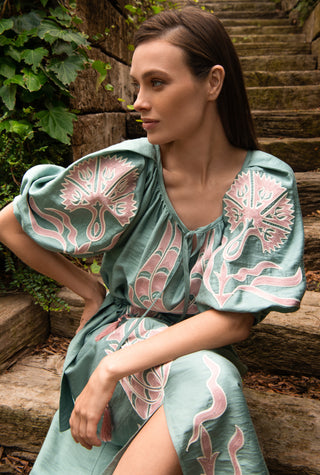 The Virginia Kaftan, in Flamenco & Ottoman. Turquoise & Rose Embroidered Silk-Linen